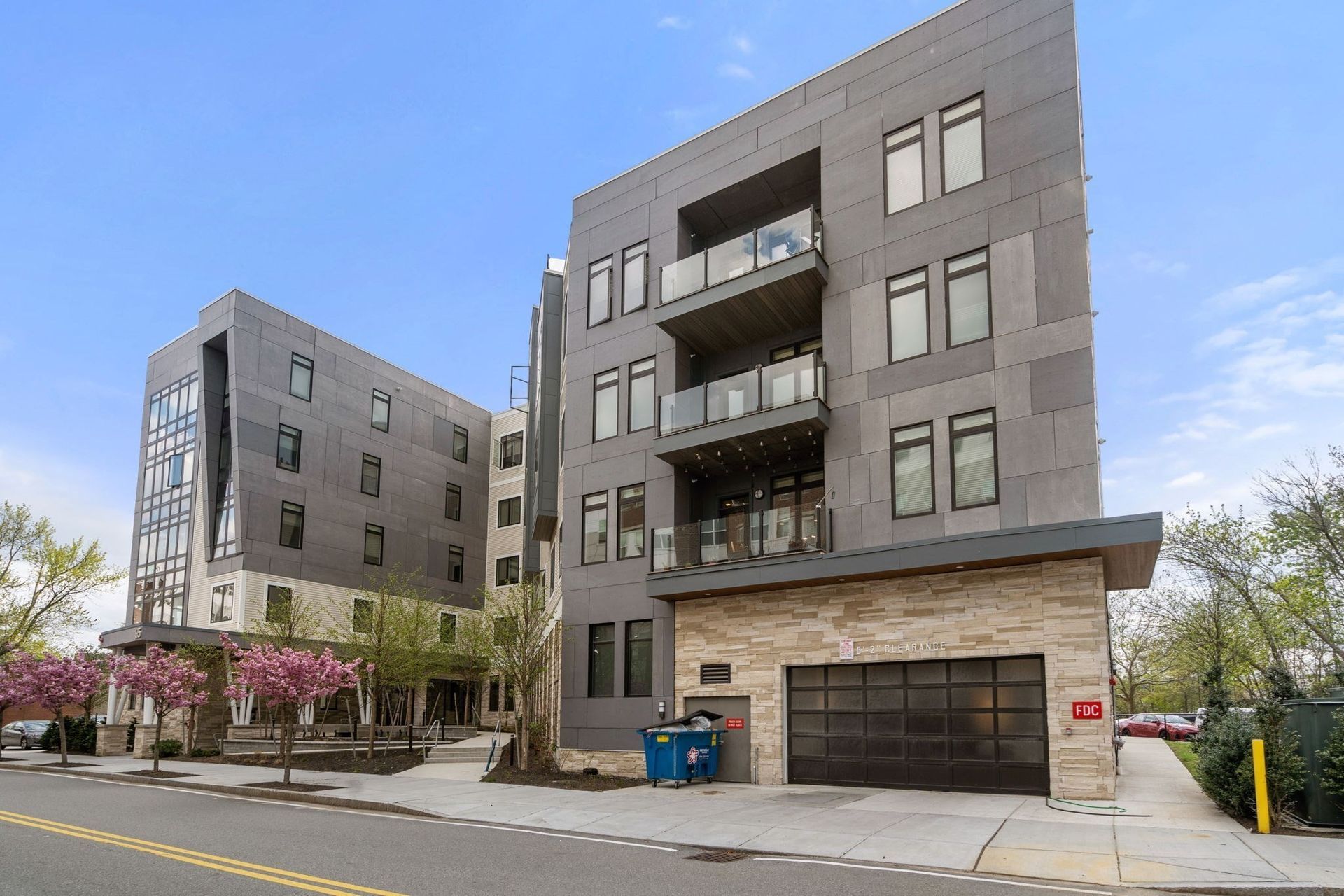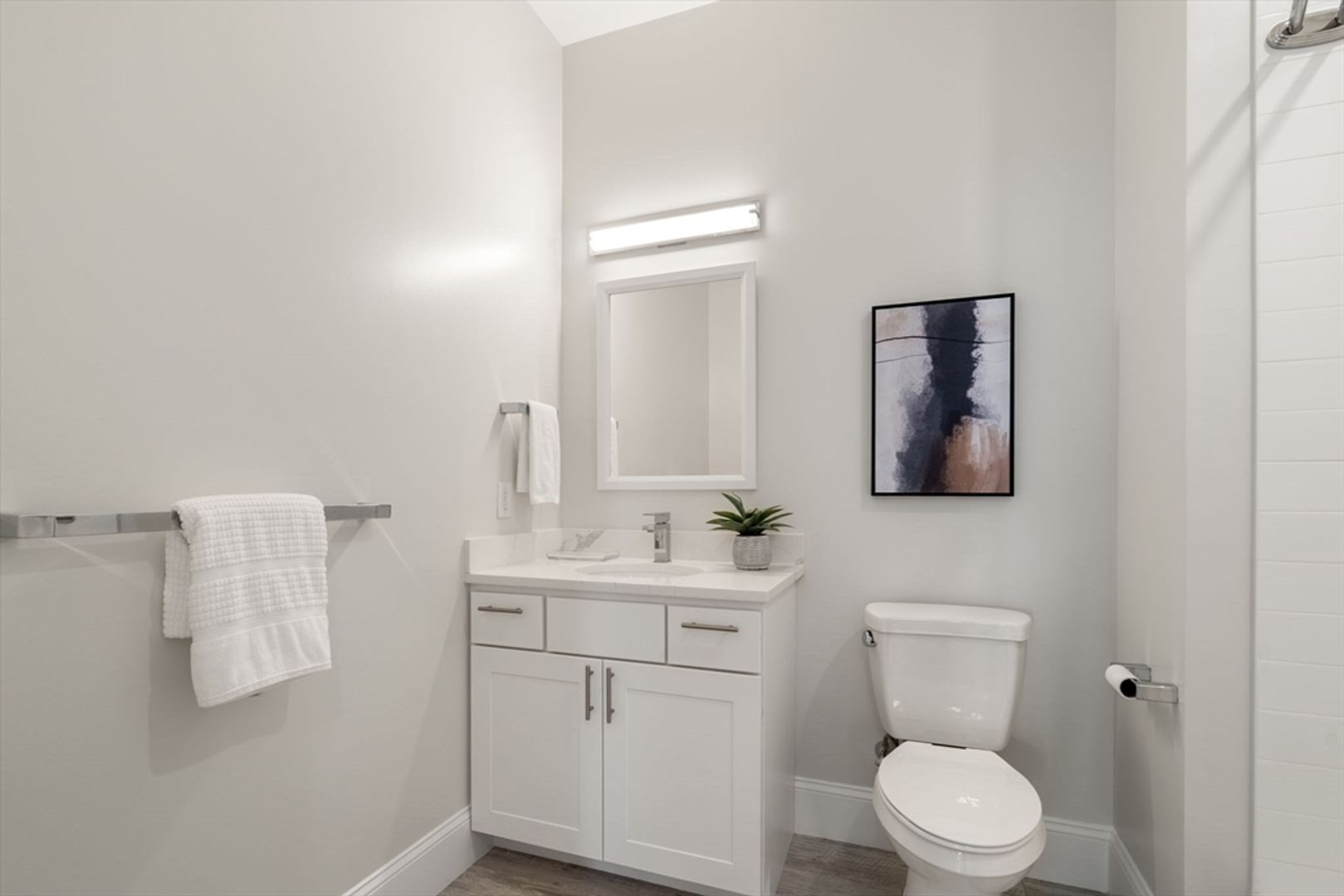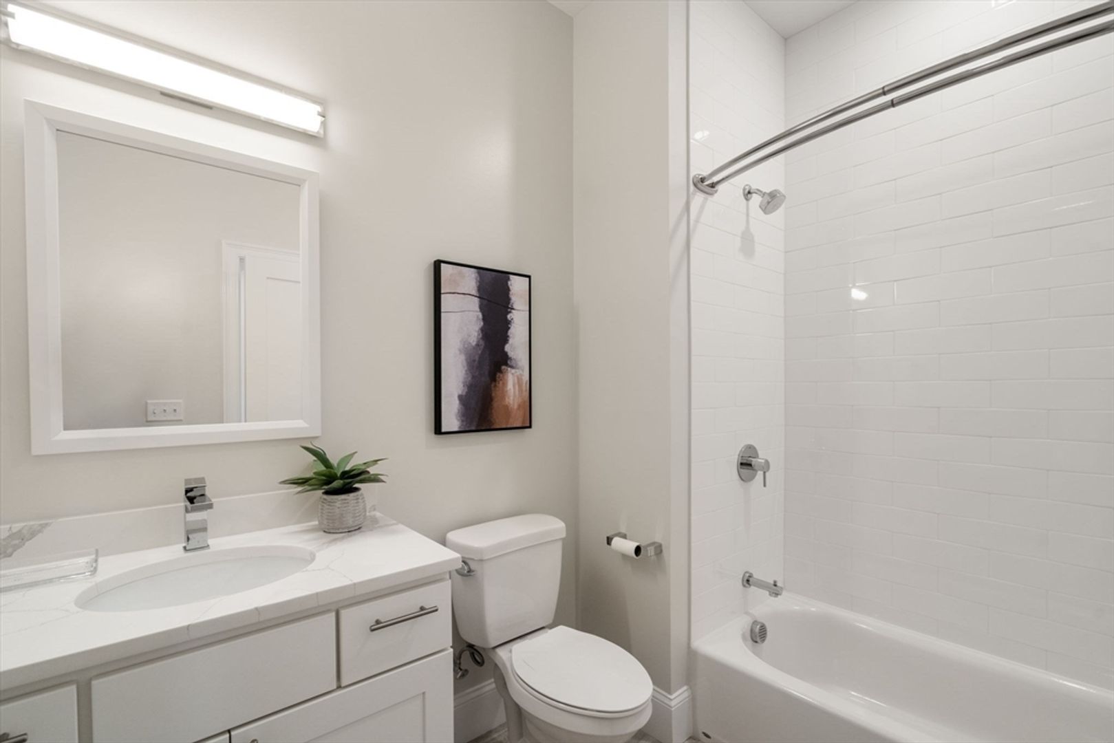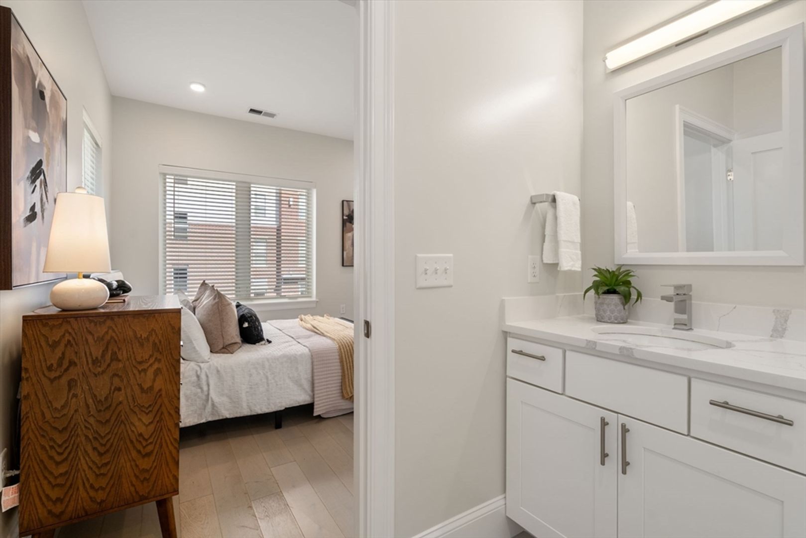 A thoughtfully designed one-bedroom home featuring an inviting living space, highlighted by wide-plank wood flooring for a warm, contemporary feel. The open kitchen offers polished quartz countertops, modern appliances, and a versatile island with generous storage options. The bedroom is spacious, with ample closet space and built-in shelving, and the sleek, modern bathroom features stylish tilework. Residents enjoy convenient amenities, including bike storage and a rooftop deck with impressive views. Ideally located near public transit, major commuting routes, shopping, and dining. Garage parking is available for rent. Photos shown are of a sample residence.